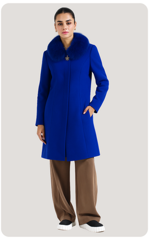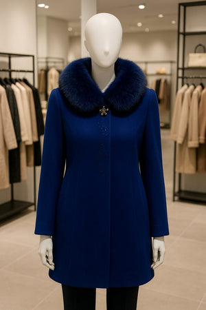 Step into sophistication with this deep navy wool coat, designed for both comfort and class. Crafted from premium wool, it offers exceptional warmth without compromising on style. The golden brooch detail adds a touch of luxury, making it perfect for formal outings or stylish winter evenings. Pair it effortlessly with jeans or tailored pants for a graceful, confident look.