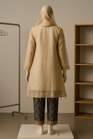 Elevate your festive and formal wardrobe with this beautifully crafted 2-piece embroidered beige organza suit, designed to bring elegance, grace, and comfort together. The shirt features intricate hand-style embroidery in soft gold and bronze tones, adding refined charm to the delicate organza fabric. Paired with luxurious navy blue brocade trousers, the outfit blends tradition with a touch of modern sophistication.