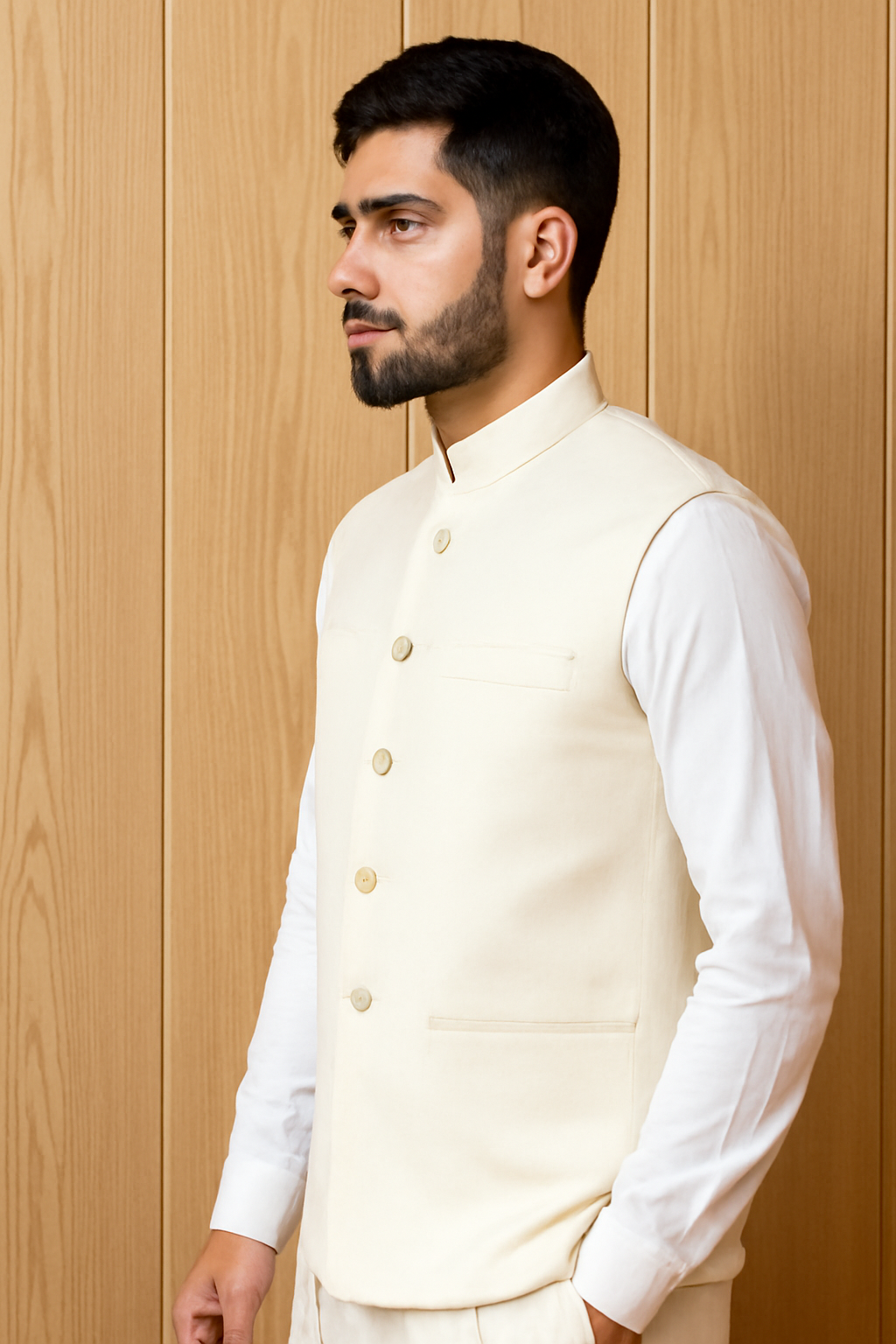 Step into timeless style with this elegant cream waistcoat, designed for the modern man. Featuring a sleek mandarin collar, button-down closure, and a tailored fit, this waistcoat adds a sophisticated touch to your outfit. Perfect for weddings, formal events, or cultural celebrations, it pairs beautifully with both traditional and contemporary outfits, ensuring you look sharp and refined.